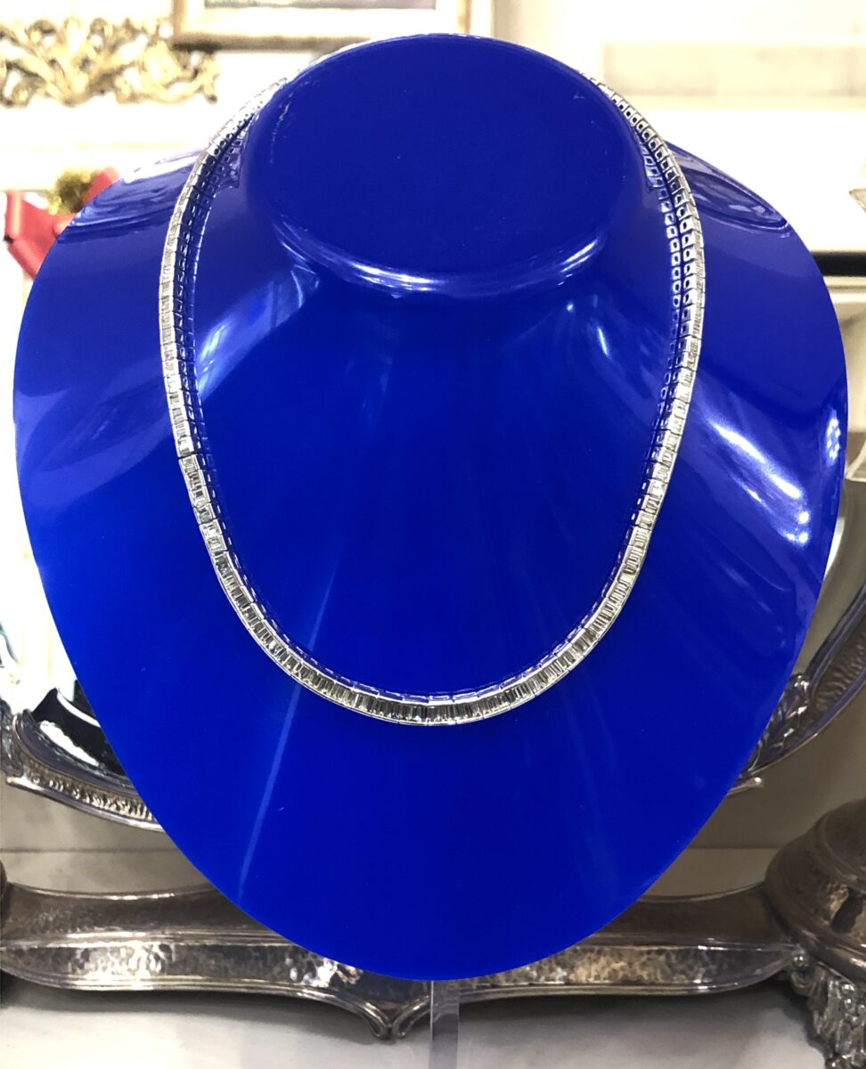 Gargantilla rivière con diamantes naturales talla baguette de 12’40 cts en total montados en oro blanco de ley 18 kts.