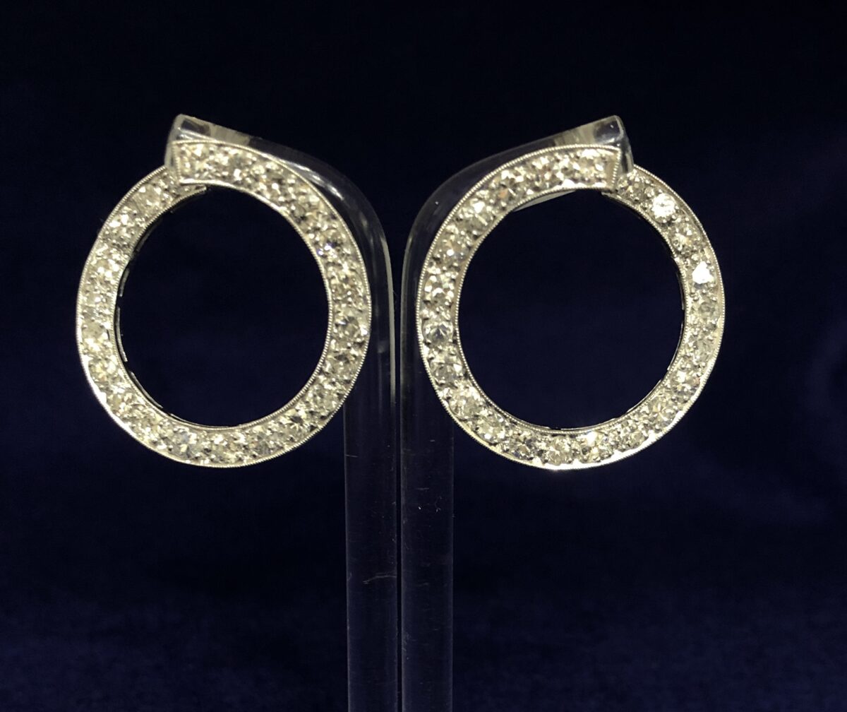 Pendientes circulares cuajados con 5’04 cts de brillantes en total, realizados en oro blanco de ley 18 kts