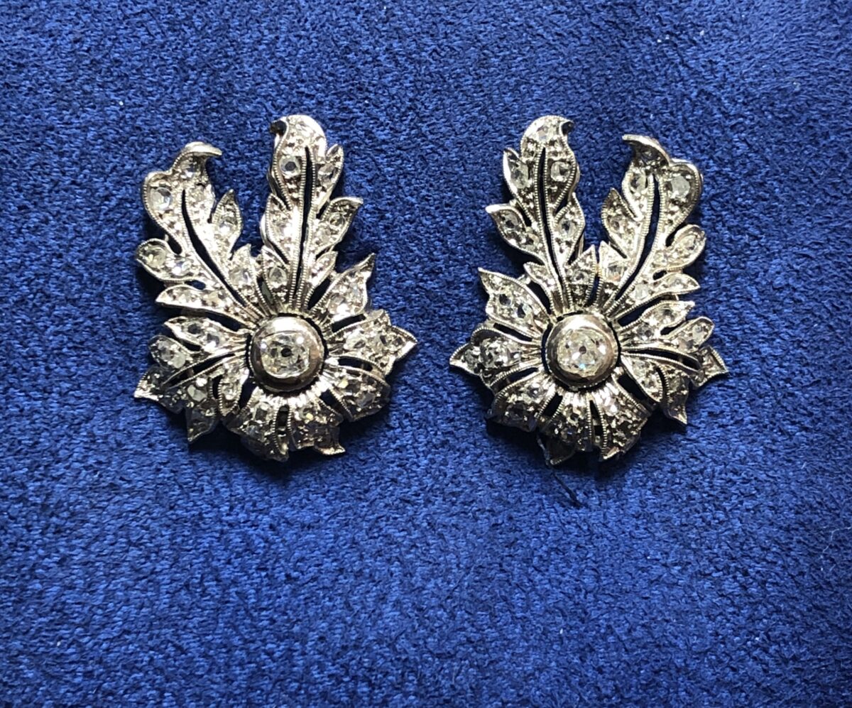 Pendientes en forma de eguzkilore cuajados de diamantes talla antigua, realizados en oro blanco de ley 18 kts.
