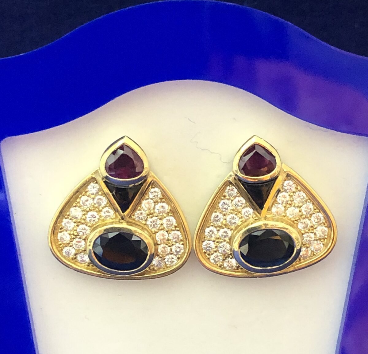 Pendientes vintage (años 70) elaborados con ónix, 1 cts de rubíes, 3 cts de zafiros y enriquecidos con 1’44 cts de brillantes en total, en oro amarillo de ley 18 kts