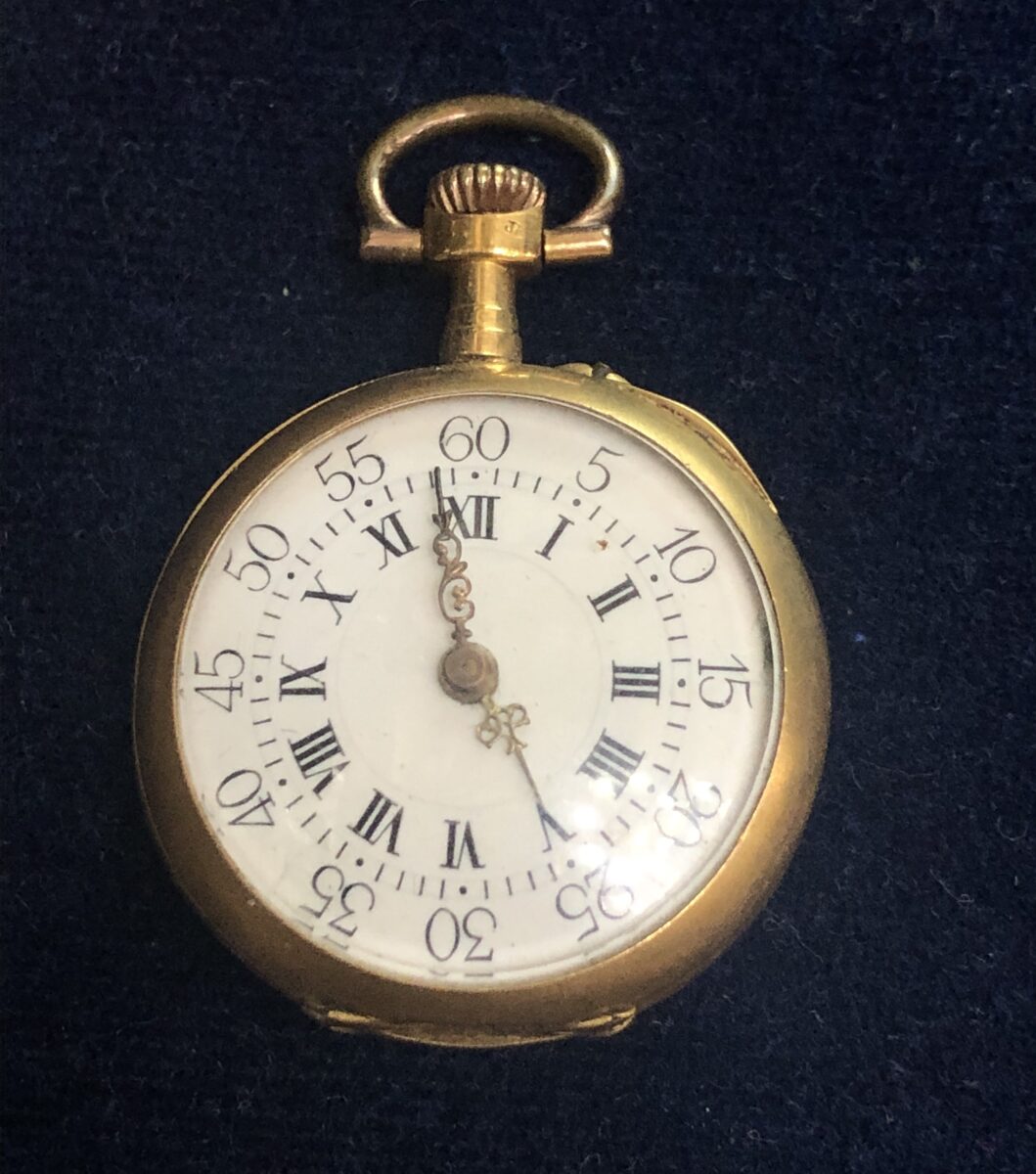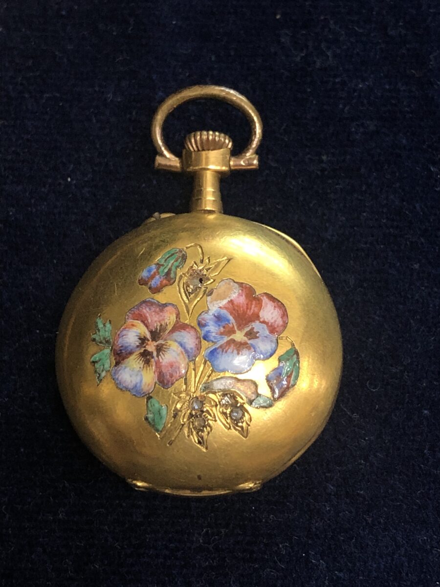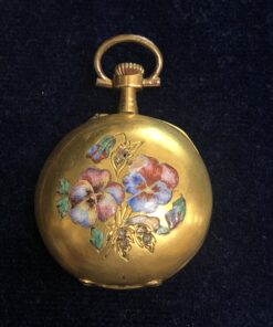 Pequeño reloj de bolsillo con motivos florales en esmalte al fuego policromado y detalles en diamantes, con agujas Luis XVI, con 10 rubíes en el movimiento, realizado en oro de ley 18 kts