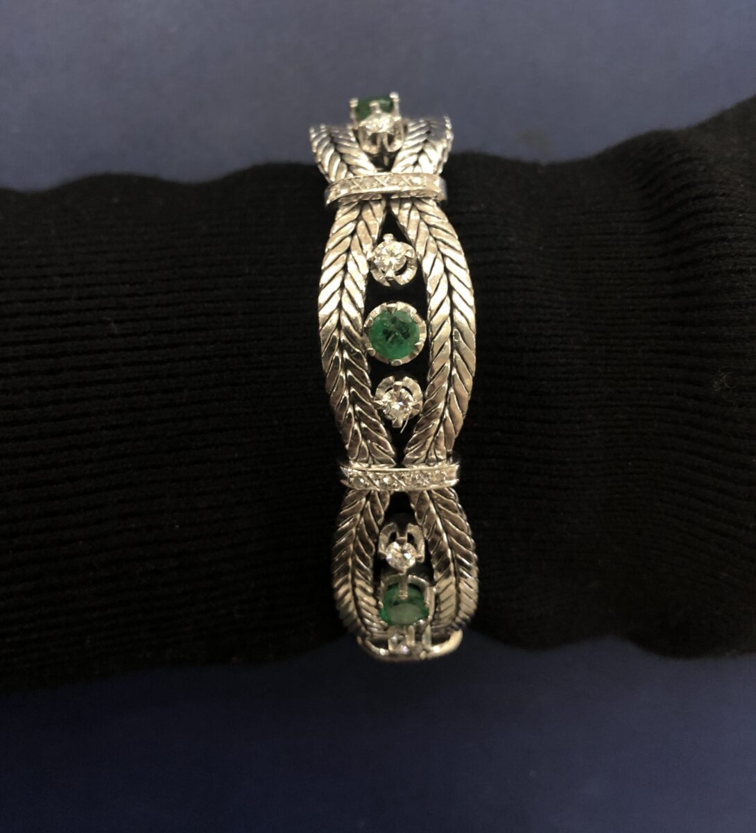Pulsera vintage (años 60) con 3 cts de esmeraldas colombianas y 2’40 cts de brillantes realizada en oro blanco de ley 18 kts.