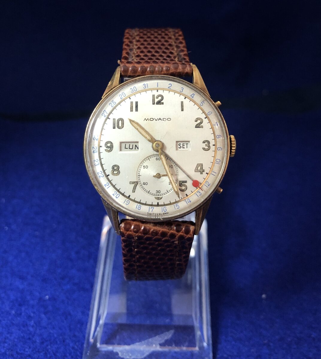 Reloj vintage Movado, con cronógrafo y calendario perpetuo, de 34 mm, en oro de ley 18 kts. con pulsera marrón de piel. Mecanismo de cuerda
