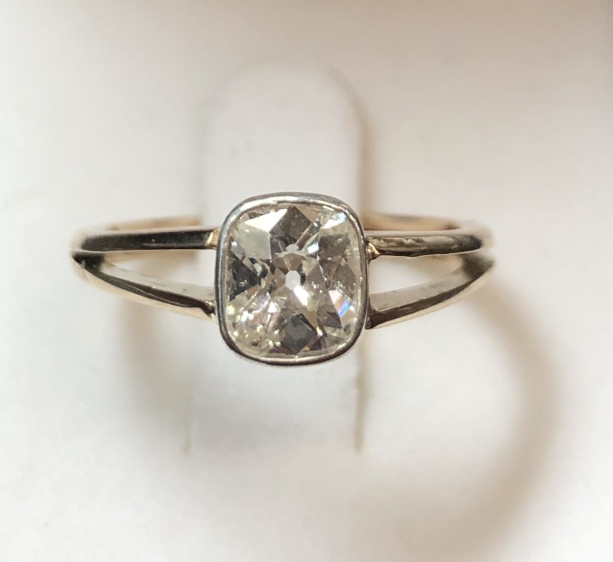 Solitario con diamante talla cushion de 1’1 cts (color H-I SV1) en oro amarillo de ley 18 kts.