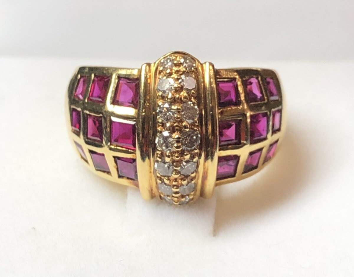 Sortija ancha con banda central de 0’30 cts de brillantes y rubíes en carré, realizada en oro amarillo de ley 18 kts.