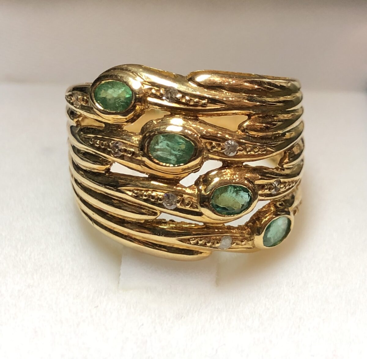 Sortija ancha con diseño trenzado y enriquecida con auténticas esmeraldas colombianas y brillantitos, en oro amarillo de ley 18 kts.
