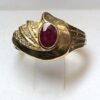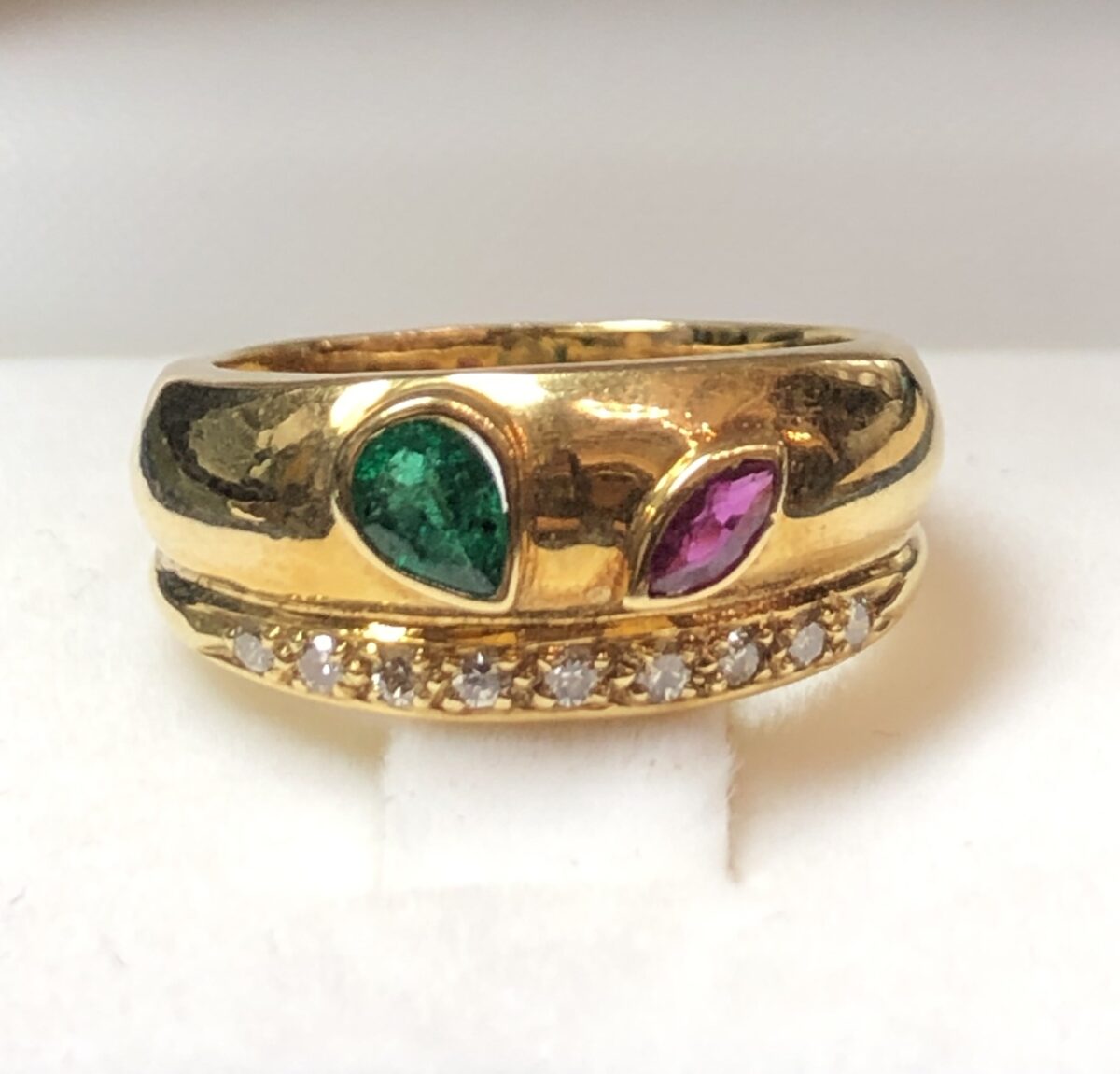 Sortija ancha con esmeralda talla pera de 0’20 cts y rubí en talla marquise de 0’08 cts con fila de brillantitos en oro amarillo de ley 18 kts.