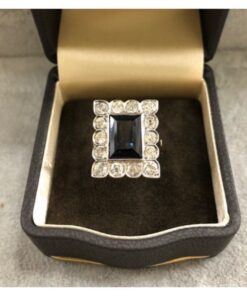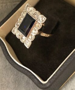 Sortija de época Art-decó con zafiro central y orla de diamantes talla brillante de 1,40 quilates en total aproximadamente, montada en oro blanco y rosa de ley 18 kilates