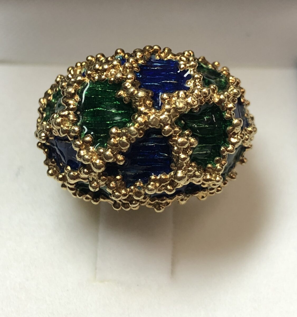 Sortija bombé con textura granulada y esmalte al fuego color verde y azul tipo cloisonné, realizado en oro amarillo de ley 18 kts.