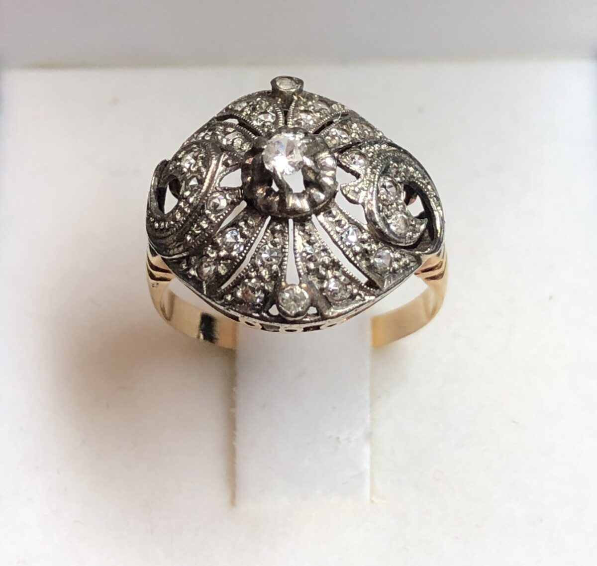 Sortija bombé vintage (años 60) con zafiros blancos en oro amarillo de ley 18 kts y vistas en plateado