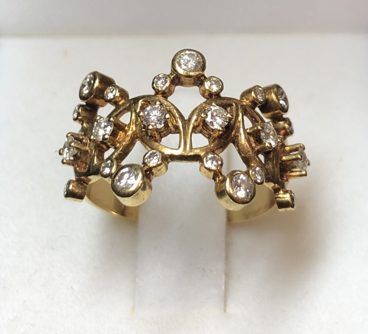 Sortija con roleos y 0’35 cts de brillantes en total, en oro amarillo de ley 18 kts.