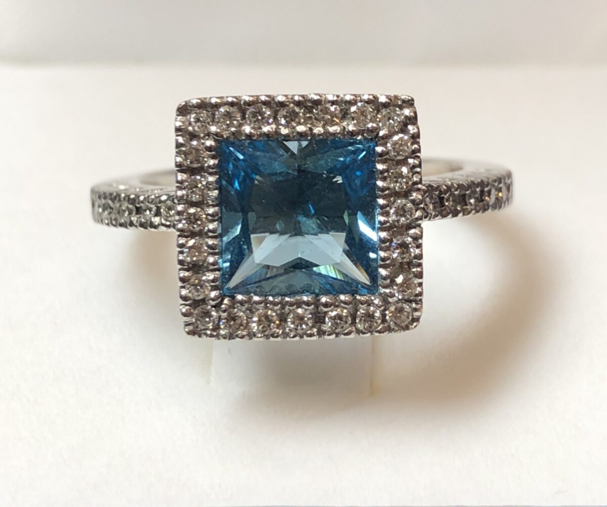 Sortija cuadrada con topacio azul y melee de brillantes de 0’50 cts en total, realizada en oro blanco de ley 18 kts.