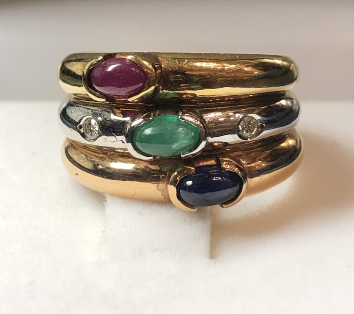 Sortija de tres aros superpuestos con rubí, esmeralda y zafiro en cabujón y dos brillantes de 0’06 cts en total, en oro blanco y amarillo de ley 18 kts.