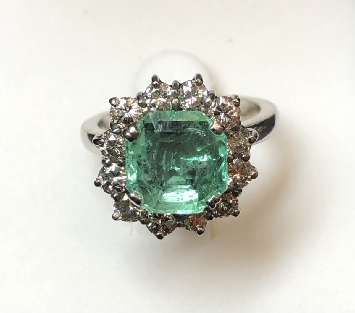 Sortija en forma de rosetón con esmeralda central de 2’10 cts y orla de brillantes de 0’60 cts en total, realizada en oro blanco de ley 18 kts