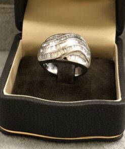 Sortija  con frente a modo de turbante con  diamantes talla baguette  de 2 quilates en total aproximadamente, montada en oro blanco de ley 18 kilates