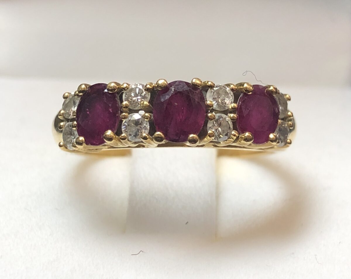 Sortija tipo cintillo con 3 rubíes y enriquecida con 0’25 cts de brillantes, realizada en oro amarillo de ley 18 kts.