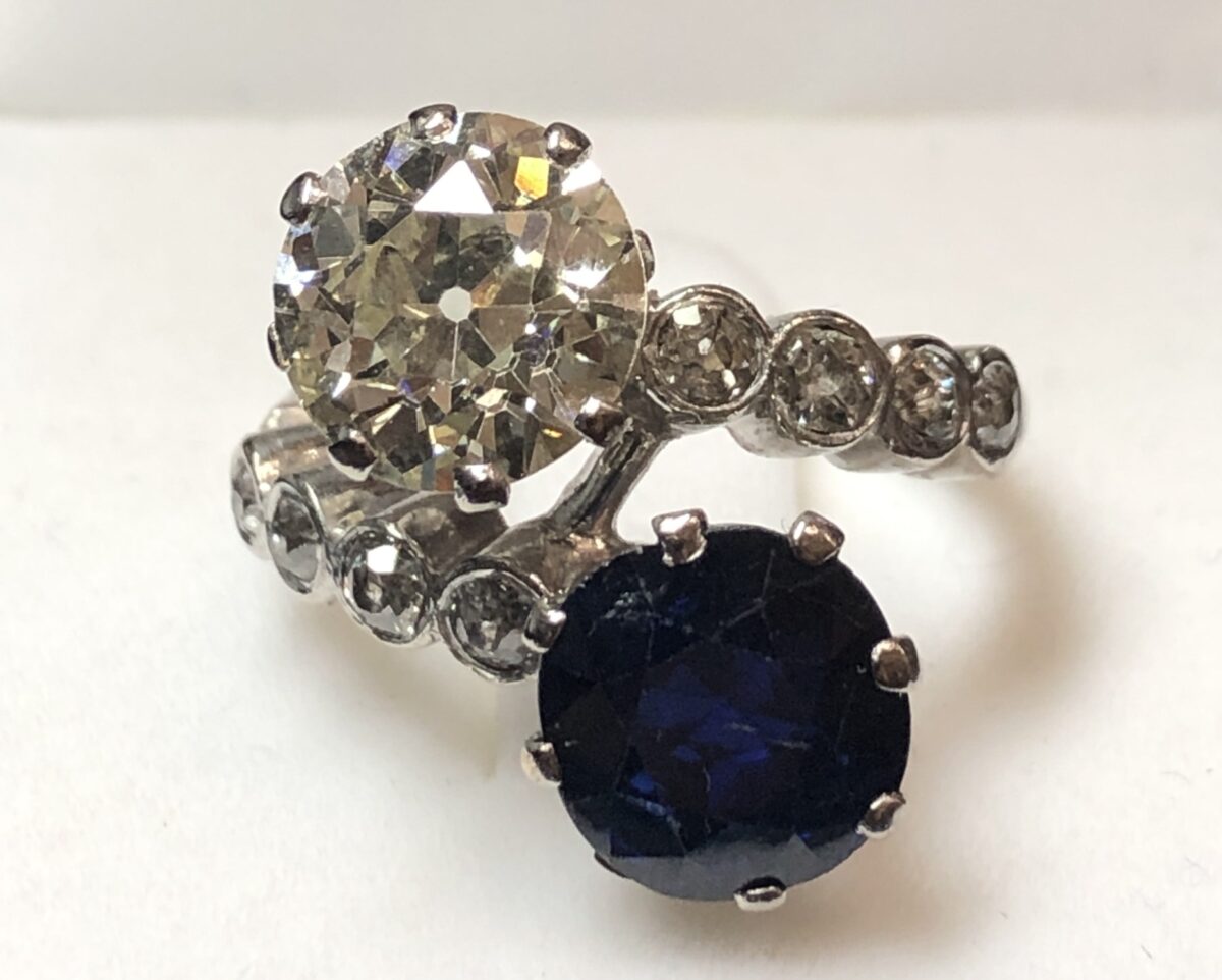 Sortija «tú y yo» con brillante principal de 2’60 cts, color K-VS1, zafiro de 2’80 cts y brillantes laterales de 0’42 cts en total, realizado en oro blanco de ley 18 kts.