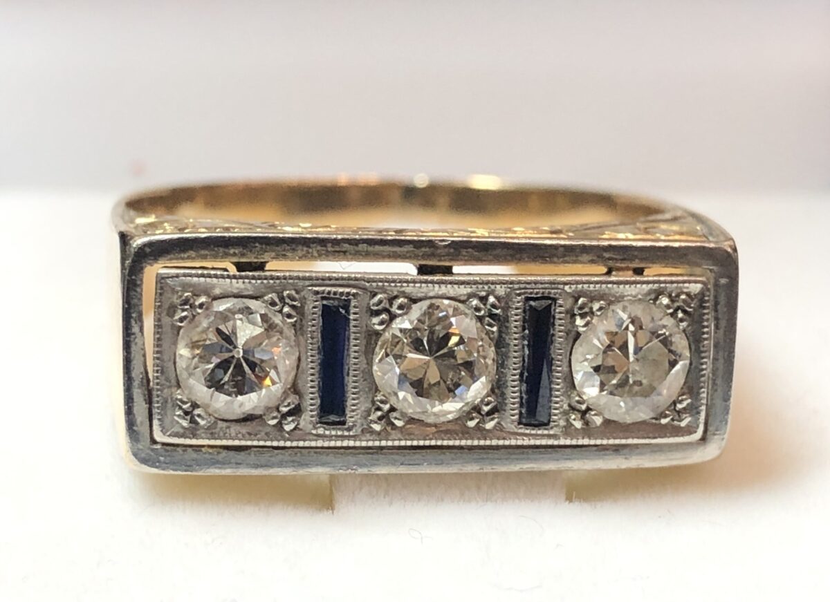 Tresillo de caballero Art Decó con 0’20 cts de brillantes y 2 bandas de zafiros realizado en oro amarillo de ley 18 kts con vistas en platino